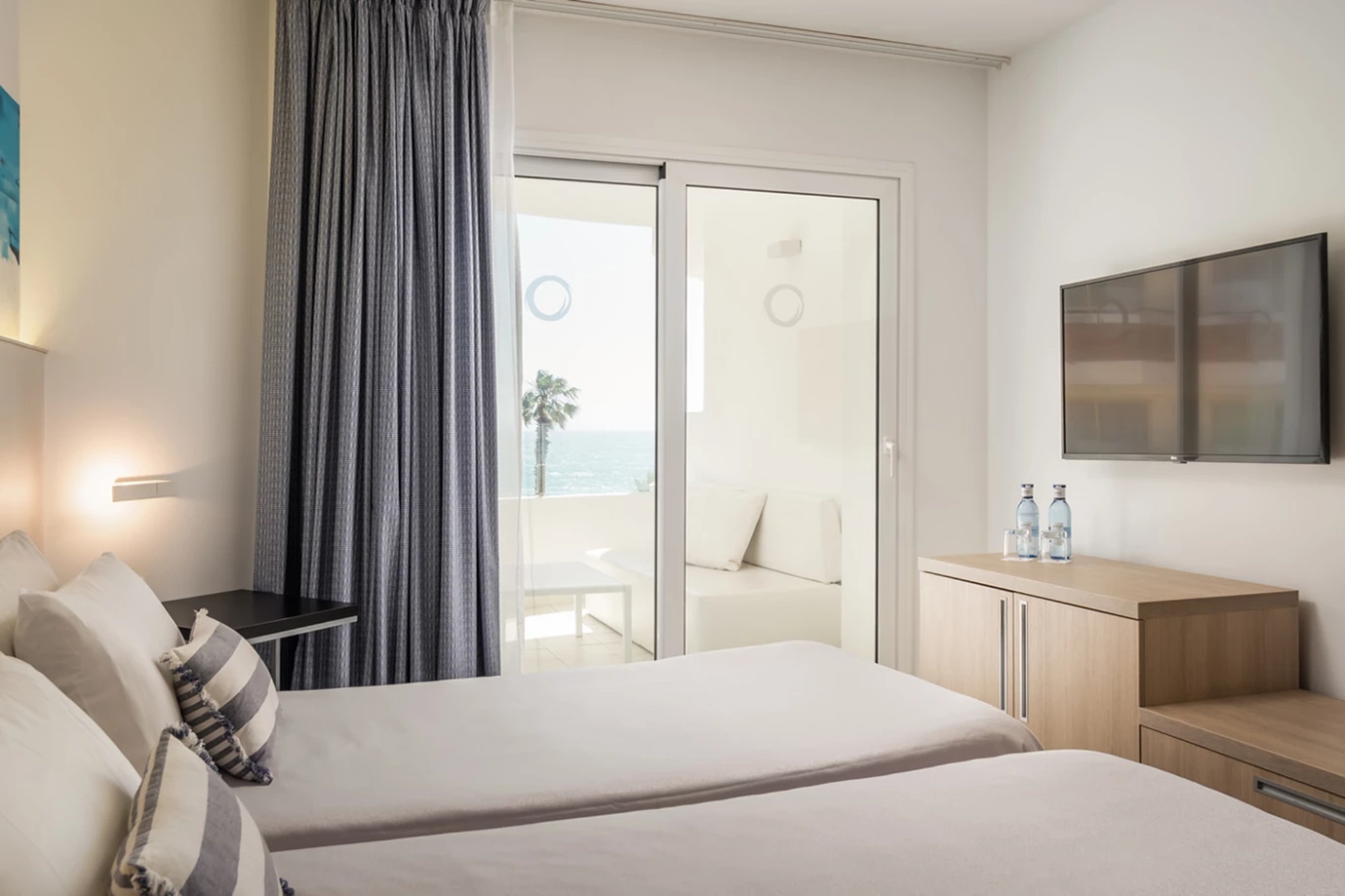 The hotel features bright, modern rooms, most with sea views and private balconies or terraces, decorated in light tones and equipped with contemporary amenities.