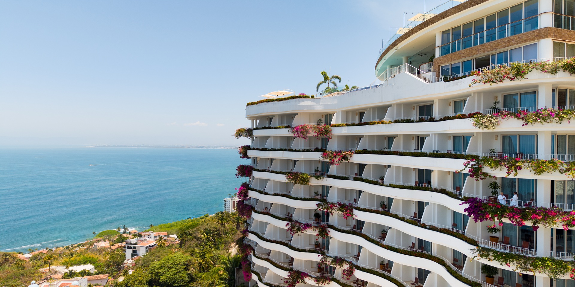 Perched in the quiet and prestigious Conchas Chinas area, just minutes south of Puerto Vallarta’s lively Malecon, Grand Miramar boasts a prime location at the highest elevation in both Puerto Vallarta and Banderas Bay. This secluded setting provides sweeping, uninterrupted views of the vast Pacific Ocean, creating a uniquely peaceful and private retreat for guests.