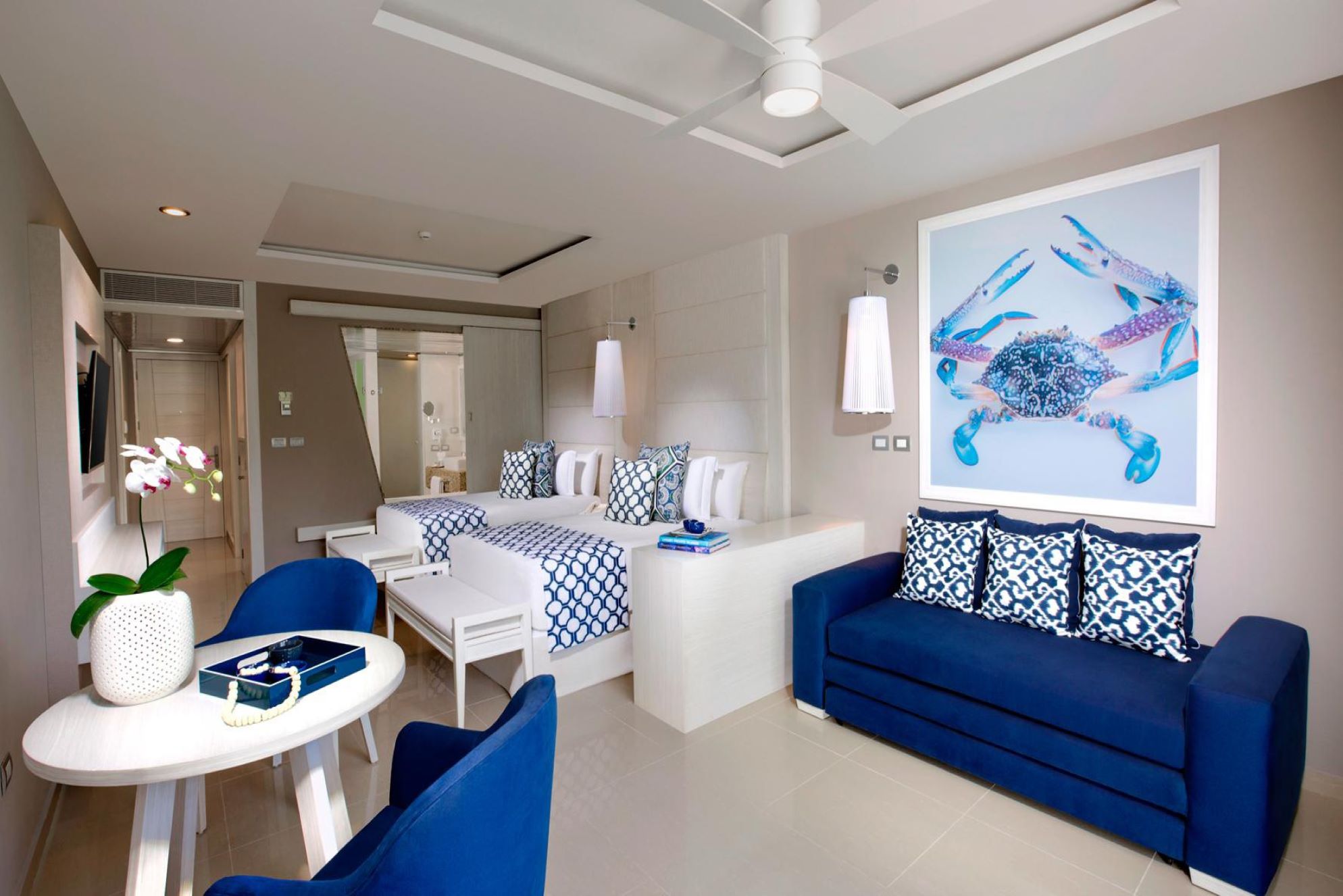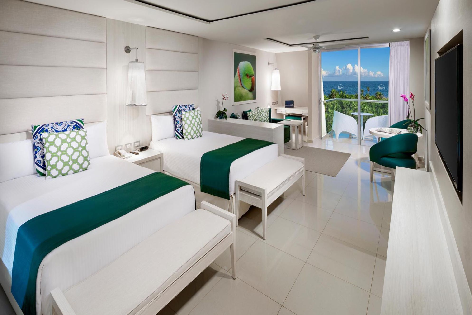 • Deluxe Junior Suite - The newly renovated Deluxe Junior Suites of the Grand Sirenis Riviera Maya Resort & Spa bring our uniquely designed, comfortable rooms to an increased level of modern luxury and style. The advanced sleek, contemporary design of each 560 sq ft units offer maximum relaxation with spectacular views. Suites are available with the option of a king-sized bed or two double beds. The updated amenities for the Deluxe Junior Suites of Grand Sirenis Riviera Maya in Mexico feature Wi-Fi and an in-room safe as part of the standard rate, as well as new flat screen TV’s and a sliding partition next to the Jacuzzi for extra privacy.