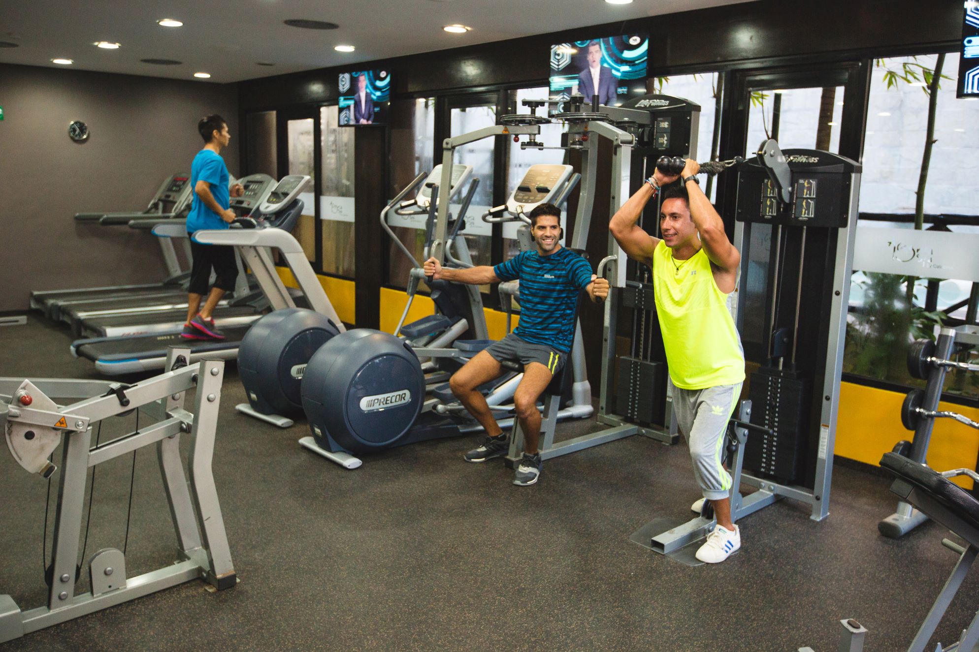 • Main floor with gym (cardio training machines, weights, and salon for spinning, yoga, and Pilates lessons)